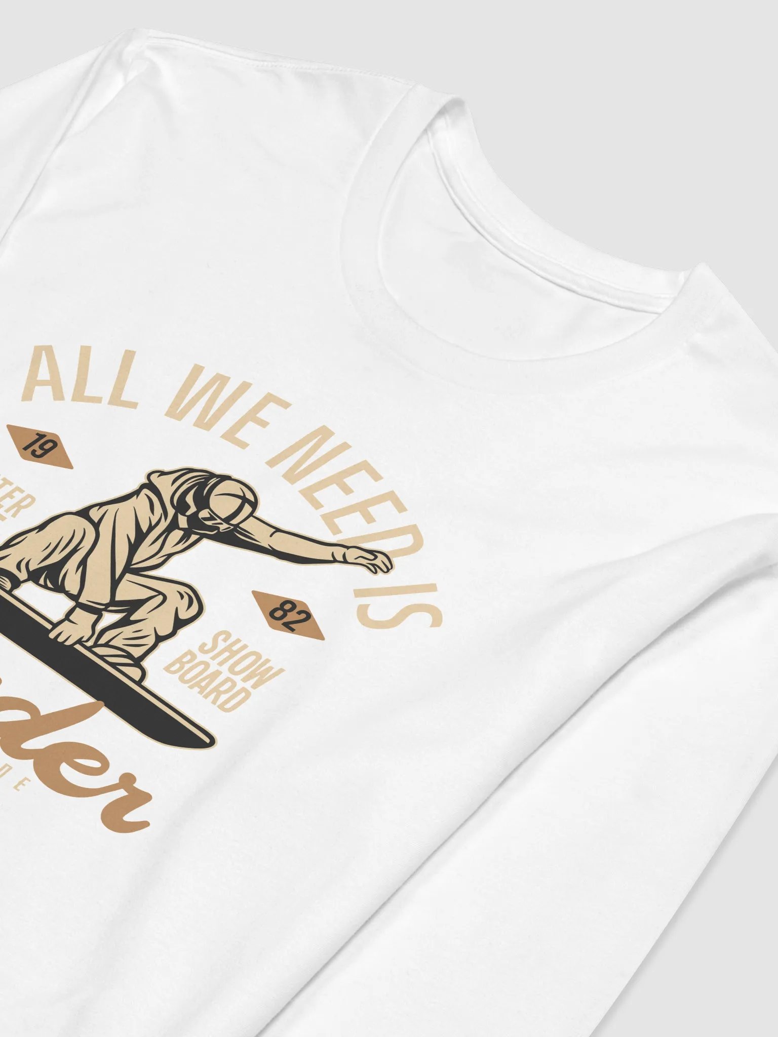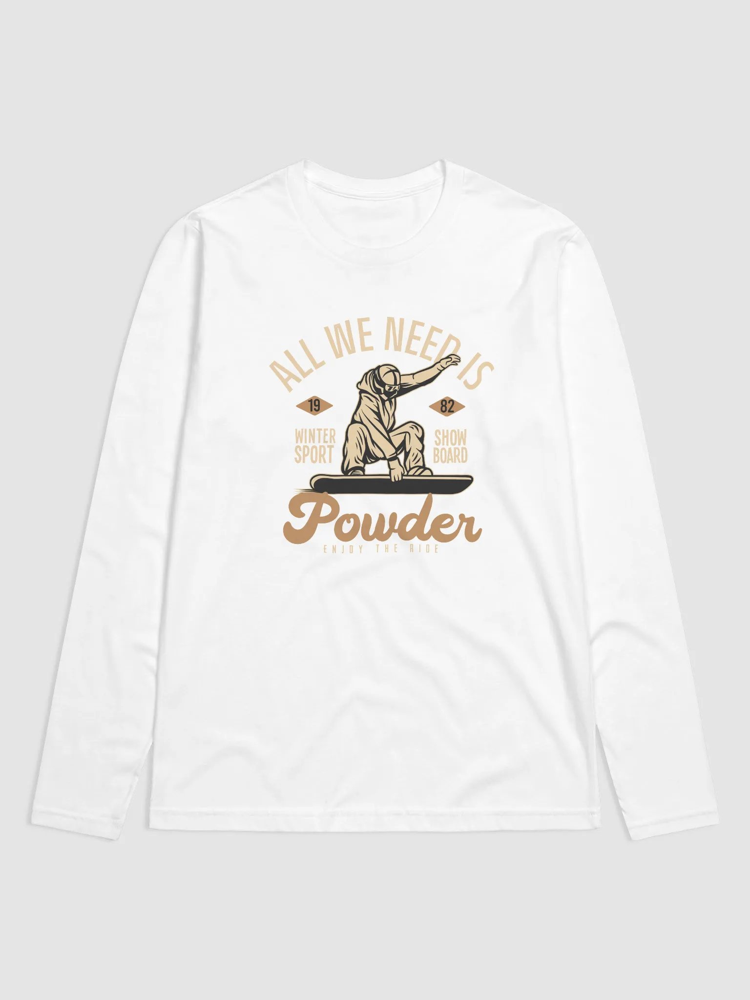 Premium fitted long sleeve crew with crouched snowboarder illustration, perfect for snowboarding enthusiasts.